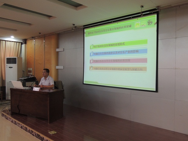 5月28日晚上7:30,音乐系2013-2014第二学期艺术实践系列活动之一三--“现代电子技术在高等音乐教育领域的应用与突破”学术讲座在音乐楼学术报告厅举行。讲座由音乐系副主任、副教授张世成主讲。音乐系党总支书记王三槐、系主任王采、副主任张世成和音乐系全体教师与100多名员工聆听了学术报告。