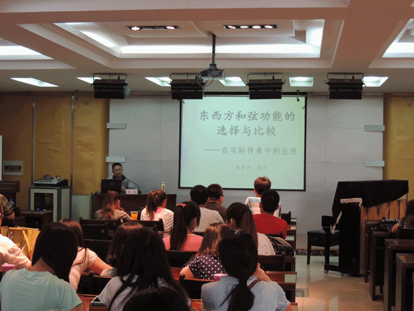杨虎副教授主要从事钢琴教学和钢琴编配与即兴伴奏方面研究,尤其是在即兴伴奏研究方面取得了优异成果,形成了自己的研究特色。此次讲座主要是从东西方和弦对比切入,通过对东西方和弦功能在实际伴奏中的应用进行了梳理分析。讲座深入浅出,生动有趣,受到了师生的欢迎!