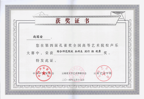 尚国安, 男,1990年出生于甘肃陇南文县。从小酷爱音乐,从初中就已坚持原创歌曲写作,在雪域词人——张雁林老师的指导下创作歌曲100余首,部分歌曲得到专业音乐人的认可并由唱片公司全国发行,如:《想起远方的姑娘》由歌手格桑旺真演唱,《雪域兄弟》由歌手阿冬龙波演唱等。通过自己不断努力和对音乐梦想的不懈追求, 2012年考入BV伟德官方网站音乐表演班学习,通过大学期间各位老师的指导和培养,2013年,在bevictor伟德的大力支持下成功举办了——个人原创歌曲演唱会,使尚国安在音乐道路上有了更大的提高。2013年7月,由公司推选尚国安代表BV伟德官方网站参加了第四届孔雀奖全国高等艺术院校声乐大赛比赛,通过自己的原创歌曲闯入决赛,最终荣获综合示范院校流行组优秀奖。在此向尚国安同学取得的成绩表示祝贺,向培育他的老师和朋友表示感谢,愿他在以后的音乐道路上走得更远飞的更高。