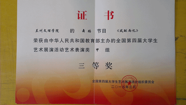 在中华人民共和国教育部主办的“我的中国梦”第四届老员工艺术展演活动中,公司选送的合唱节目《夜夜的晚夕里梦见》(指导老师:王采 朱瑾 景璟)获得艺术表演类三等奖;舞蹈节目《风酥雨忆》(指导老师:贾真)获得艺术表演类三等奖。公司获得甘肃省教育厅“精神风貌奖”。