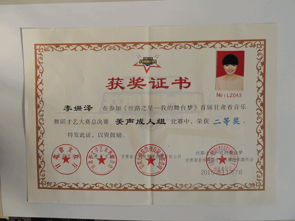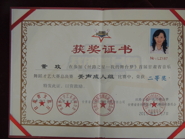 2015年11月在甘肃省文化厅、甘肃省文联主办的“丝路之星--我的舞台梦”首届甘肃省音乐舞蹈才艺大赛总决赛比赛中,公司教师董玫、李姗泽以出色的演唱表现与功底,分别荣获美声成人组比赛二等奖的好成绩,本次优异成绩的取得充分展示了公司教师的专业水平,也为公司争得了很好的声誉。