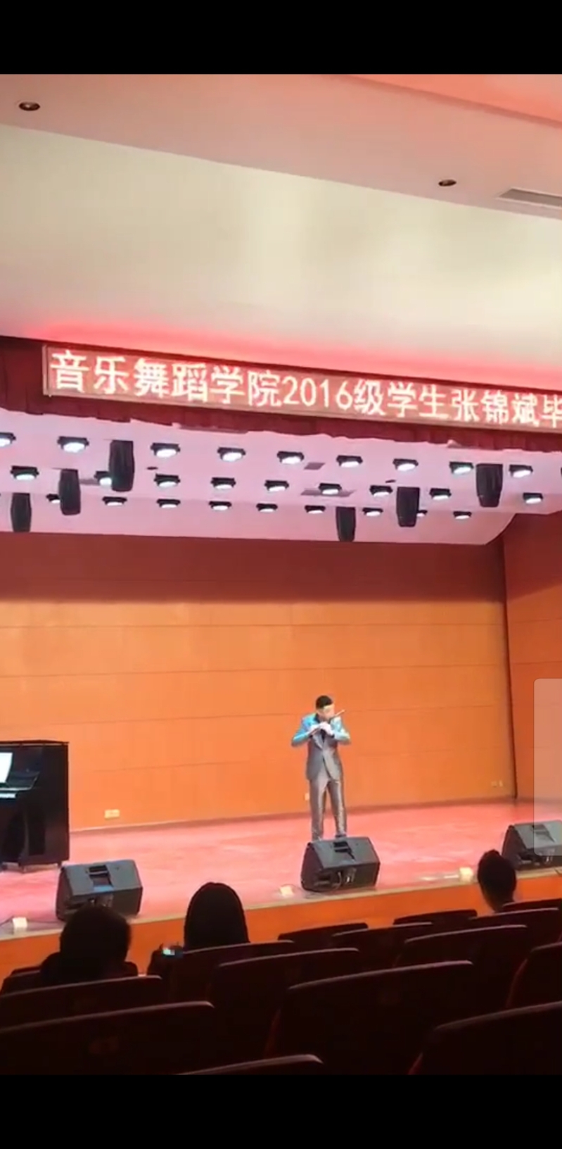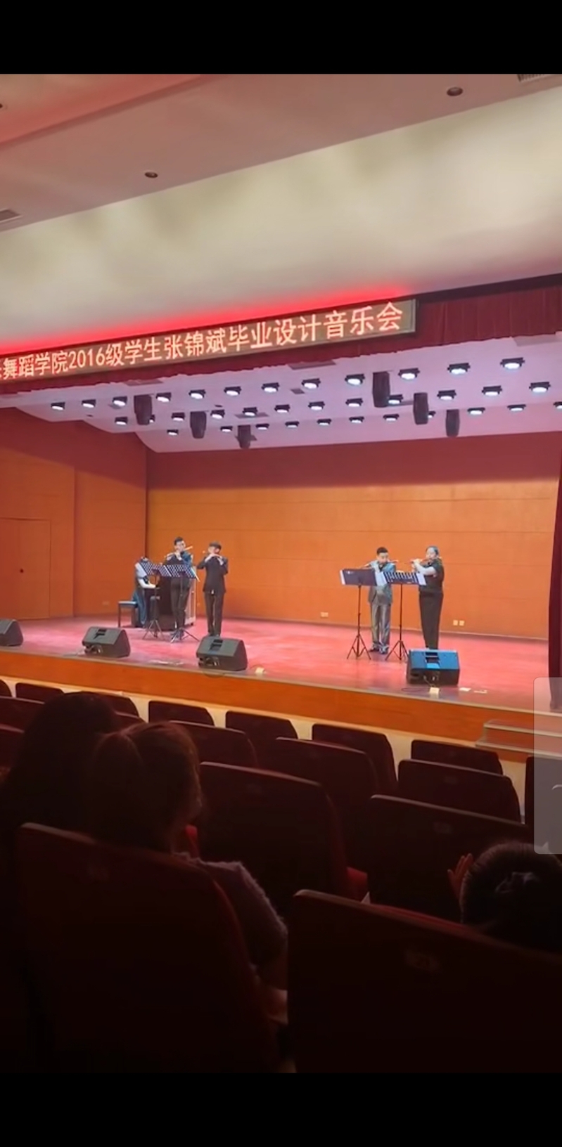 张锦斌同学一共演奏了六首曲目。分别是走进快活岭,大青山小,早晨,走西口,跑旱船,秦川抒怀。并邀请了四位特邀嘉宾前来助演。优美的笛声让在场的观众沉醉其中。音乐会在一首《走西口》中画上了圆满的句号。