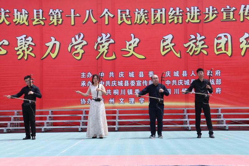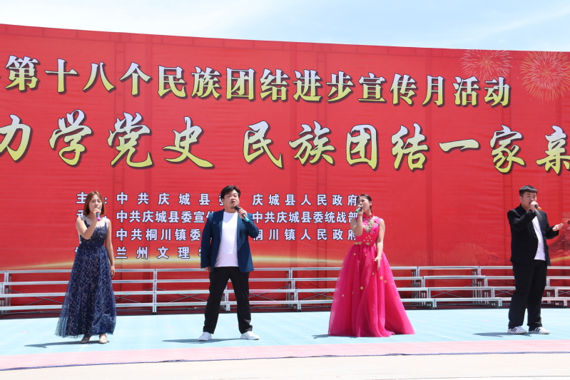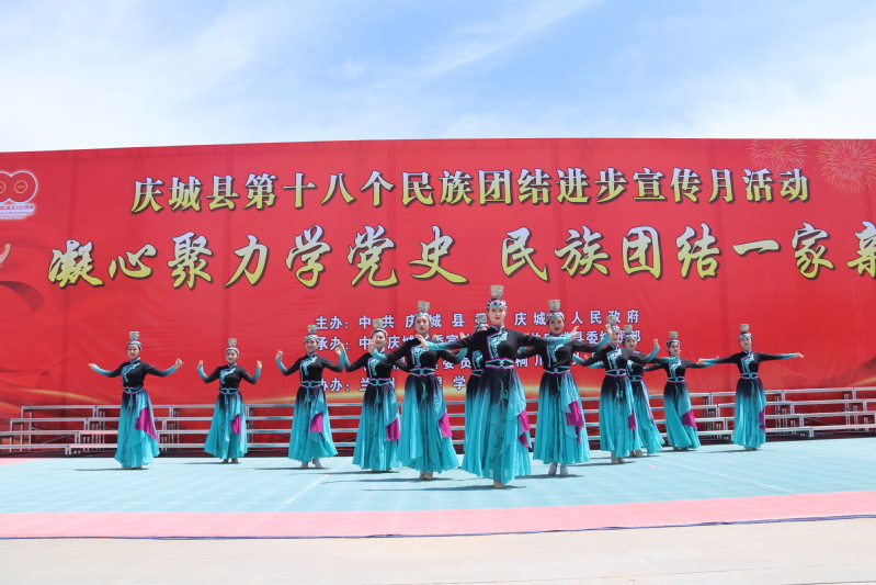 开幕式上,公司师生为庆城县广大人民群众呈现了由李莉、杨虎等老师指导的藏族舞蹈《吉祥热巴》、竹笛重奏《扬鞭催马运粮忙》《牧民新歌》、男声独唱《五星红旗》《等待》、二胡重奏《葡萄熟了》《赛马》、蒙古族舞蹈《草原的祝福》、男、女声重唱《相亲相爱》等节目。整个演出活动自始至终台上演员们的歌声嘹亮、舞姿优美、主题鲜明、积极向上,台下观众的掌声、喝彩声不断。活动节目尽显“凝心聚力学党史,民族团结一家亲”的特色,演员们的精彩表演给大家带来了一场精神大餐,广大群众通过观看节目感受到了党的关怀和各民族文化的异域风情及文化的精髓。