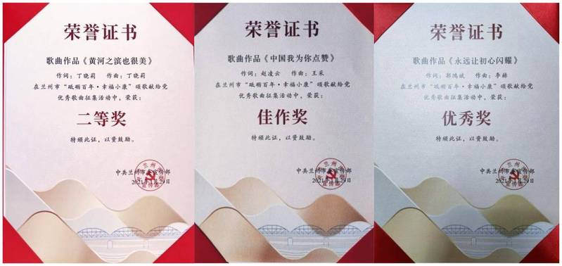 5月28日下午,由中共兰州市委宣传部主办,市教育局、市文旅局、市文联共同举办的“砥砺百年·幸福小康——颂歌献给党”优秀歌曲征集活动颁奖仪式在兰州电视台举行。市委宣传部常务副部长王耀宏、市教育局党组成员、副局长 张达等领导亲临现场为获奖作品颁发奖项。公司丁晓莉、王采、李赫、郭鸿斌报送的原创歌曲作品《黄河之滨也很美》、《中国我为你点赞》、《永远让初心闪耀》分别荣获此次征集活动的二等奖、佳作奖和优秀奖。同时丁晓莉、李赫代表公司应邀参加颁奖仪式。作品《黄河之滨也很美》、《永远让初心闪耀》也在颁奖现场得到了展示,获得了在场观众与领导的一致好评。
