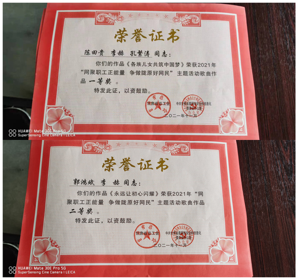 由甘肃省总工会、甘肃省网委信办主办的2021年“网聚职工正能量 争做陇原好网民”主题作品征集活动中,开展了网络正能量微视频 、摄影、诵读等五类作品的征集,共收集到全省30多家工会组织报送的作品1122部。经过层层遴选、专家评审,272部作品脱颖而出,其中公司选送的由陈田贵作词、李赫、孔繁涛作曲的作品《各族儿女共筑中国梦》荣获2021年歌曲作品一等奖;郭鸿斌作词、李赫作曲的作品《永远让初心闪耀》荣获2021年歌曲作品二等奖。