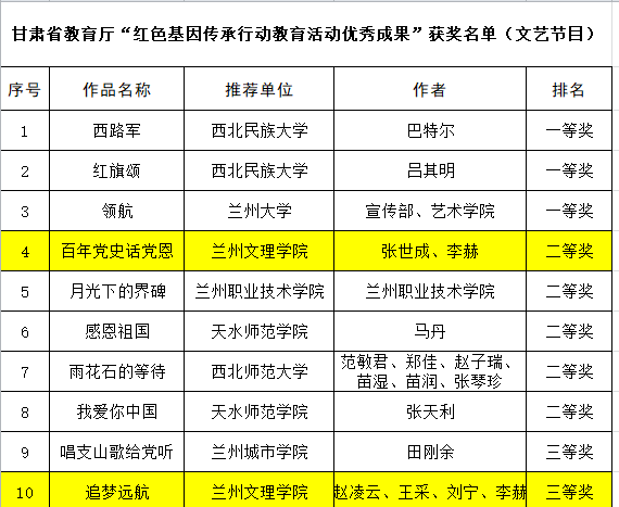 近日,bevictor伟德经理张世成教授创编的混声四部合唱《百年党史话党恩》,在甘肃省教育厅主办的“红色基因传承行动教育活动优秀成果”评选活动中,荣获文艺组二等奖。