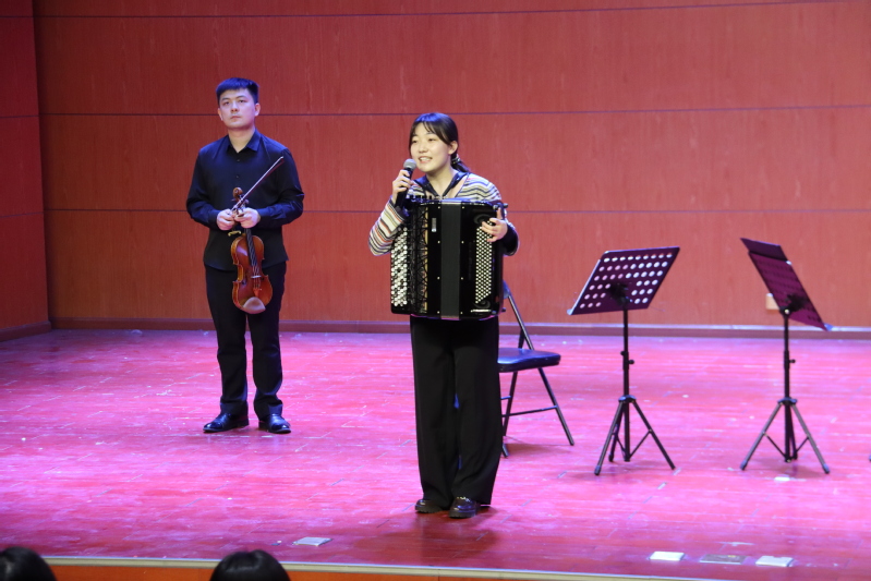 本次讲座为2023年甘肃省文化和旅游厅、甘肃省音乐家协会手风琴专业委员会、兰州大剧院主办的“金城琴韵”手风琴艺术节系列活动之一,王婧洋以《在音乐的世界里与手风琴对话》为主题,与在场师生分享了她作为一个兰州姑娘一路成长为中国最有潜力的青年演奏家的经历及先后在中央音乐公司、以及国外音乐公司学习经历,以及现就读的维也纳市立音乐艺术大学的课程设置以及各种项目学习与反思,并与公司师生进行互动。这些不仅开阔了公司师生视野,也启发并引导同学们对自我音乐发展道路以及学习路径进行规划。
