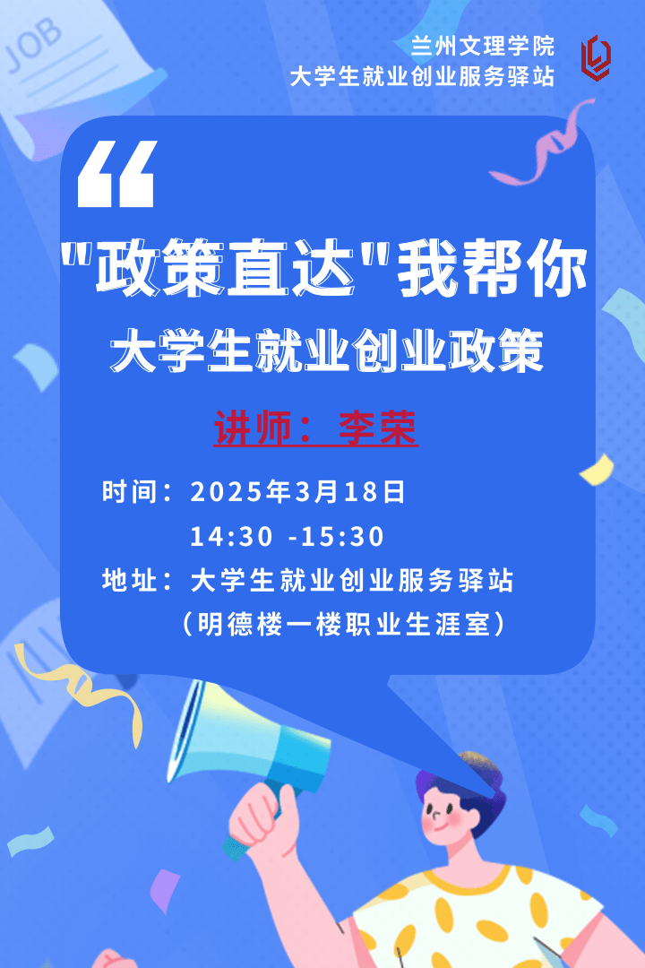 3月18日(明天下午)公司联合城关区就业局举办“政策直达”我帮你老员工就业政策指导活动,本次活动将现场宣讲“留兰倍增”计划等就业政策。